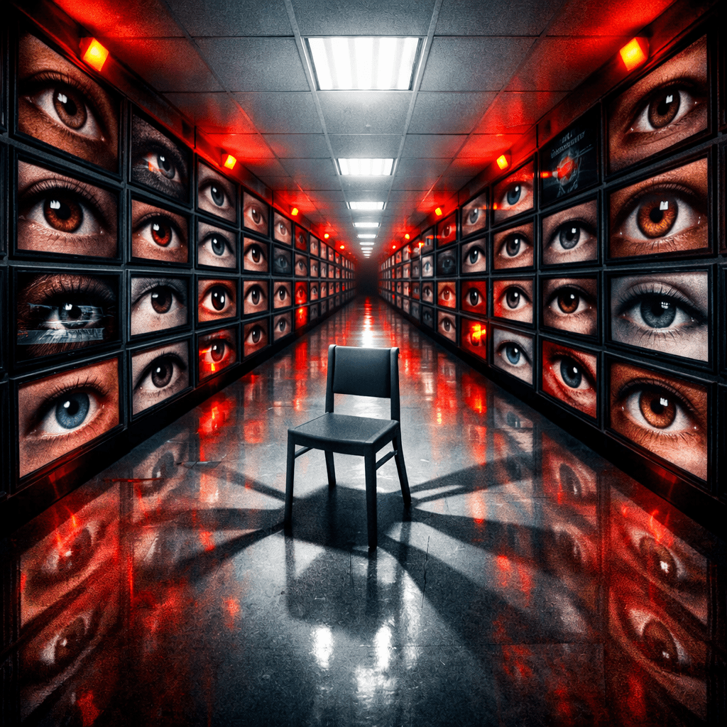 The doors open onto a corridor lined with red rooms. Dozens of them. In each one, a chair. A wall of monitors. And behind those monitors—